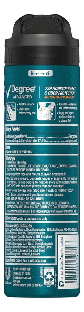 Presentado en un práctico formato spray, Degree te permite aplicarlo de manera uniforme y sin esfuerzo. La línea Advanced asegura que te sientas seguro y fresco, sin preocuparte por las manchas en tu ropa. El diseño del producto evita la transferencia de residuos, por lo que puedes disfrutar de tu día sin preocupaciones.