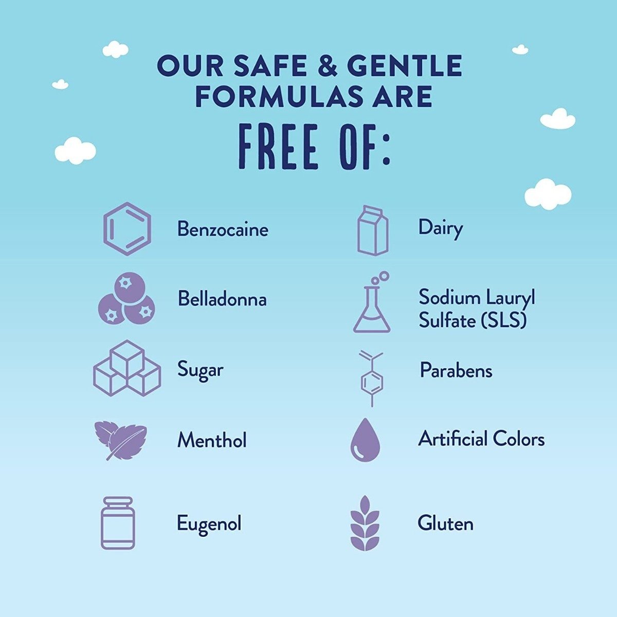 Libre de: los geles refrigerantes están libres de benzocaína, así como libres de colores artificiales, mentol, azúcar, parabenos, belladona, laurel sulfato de sodio, gluten y lácteos.