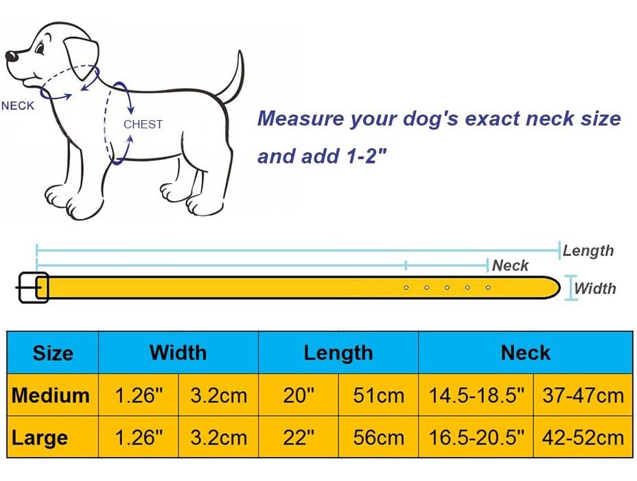 Por favor, compruebe el tamaño exacto del cuello de su mascota antes de confirmar el pedido / Tamaño mediano: 1,26 “* 20” (3,20 cm * 51 cm), cuello 14,5-18,5 “(37-47 cm) / Tamaño grande: 1,26 “* 22” (3,20 cm * 56 cm), cuello 16,5-20,5 “(42-52 cm)