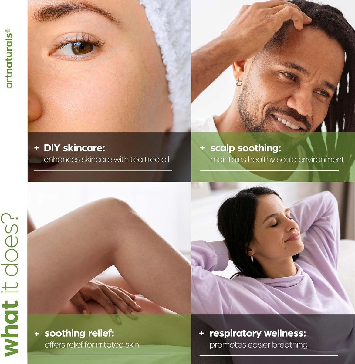 Purifica y bienestar: Apoya la piel y el pensamiento agudo. El aroma fresco del aceite de árbol de té es ideal para difundir durante la temporada fría.