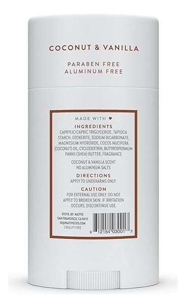 Sin aluminio. El desodorante nativo no es un experimento químico y está fabricado sin aluminio, parabenos, ftalatos y talco. El desodorante natural contiene ingredientes de origen natural.