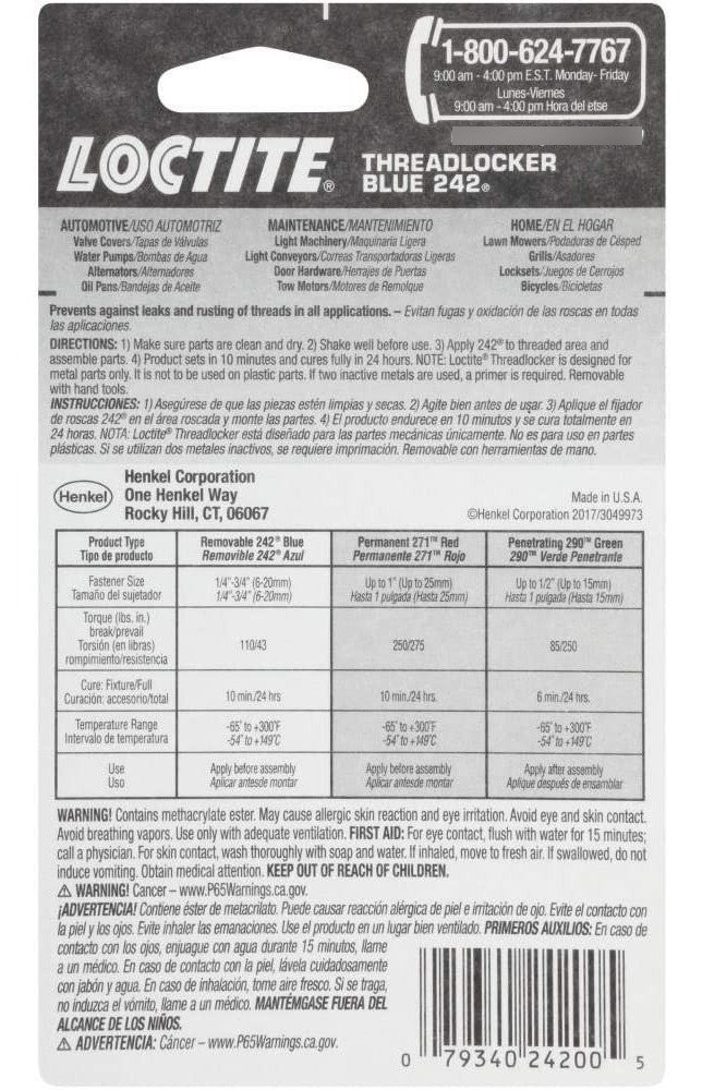 Fijador de roscas Loctite Blue 242, tubo de 6 mL.