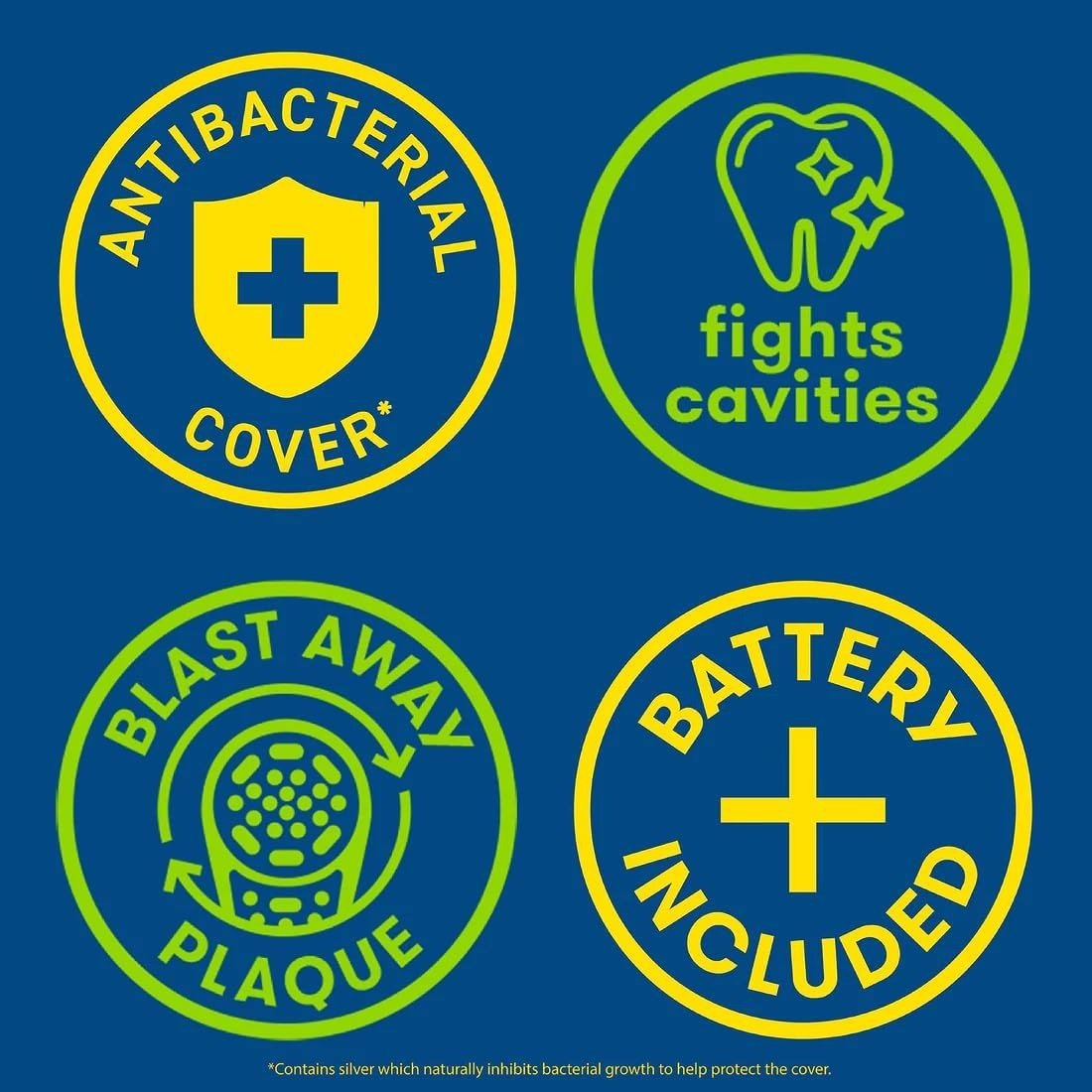 Cepillo de dientes. El zumbido de la potencia giratoria y las cerdas suaves ayudan a alentar a los más pequeños a cepillarse de manera efectiva. Con un poder de limpieza más fuerte para eliminar la placa que un cepillo de dientes manual para niños, las manos pequeñas pueden eliminar la placa de sus dientes. El diseño del tamaño de un niño hace que sea más fácil para los niños limpiar esas áreas difíciles de alcanzar de su boca, mientras que la acción de masaje de las cerdas suaves de primera calidad limpia suave y eficazmente entre los dientes y a lo largo de la línea de las encías. Este cepillo de dientes para niños funciona con pilas.
