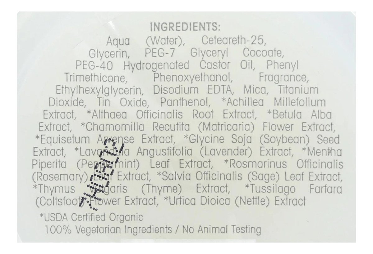 | Ingredientes destacados | Aceite de ricino hidrogenado, Agua, Betula Alba, ceteareth-25, Chamomilla Recutita, Equisetum Arvense, Extractos orgánicos certificados (Achillea Millefolium, Glicerina, Glycine Soja, Lavandula Angustifolia, Rosmarinus Officinalis |