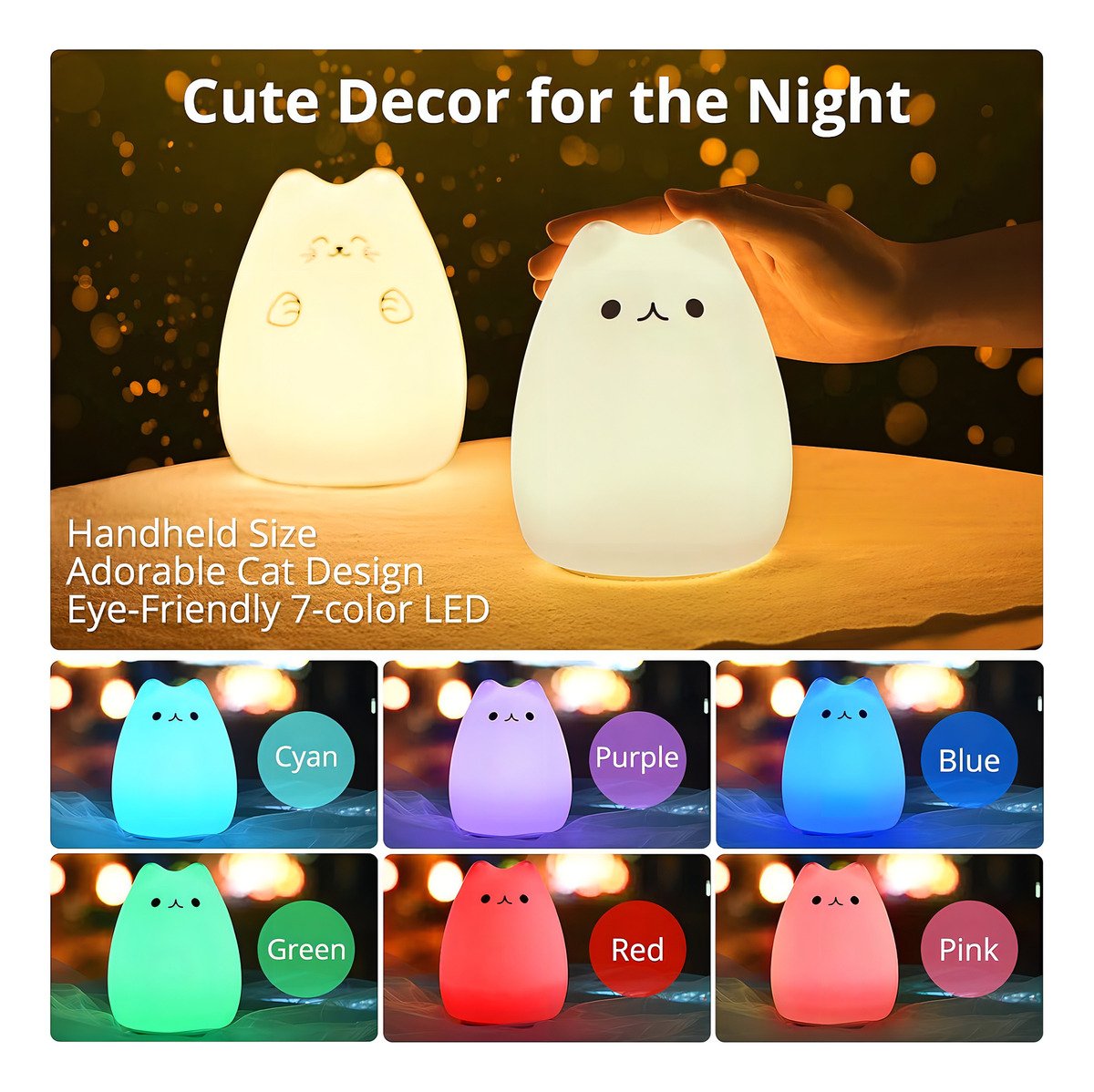 El paquete incluye una lámpara de noche portátil Goline Super Cute Kitty, un cable USB de 2.7 ft y un manual de usuario.