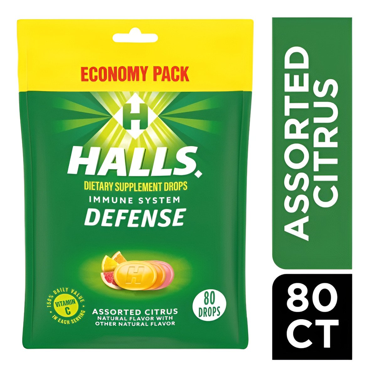 Las gotas variadas de vitamina C cítrica de HALLS Defense están repletas de un valor diario del 150 por ciento de vitamina C por porción para brindar apoyo al sistema inmunológico. Los variados sabores cítricos hacen que tomar sus vitaminas sea una experiencia sabrosa. Como complemento alimenticio, basta con tomar dos gotas vitamínicas HALLS al día, pero no superar las seis raciones al día. Este paquete económico de suplementos de vitamina C contiene 80 pastillas para la garganta.
