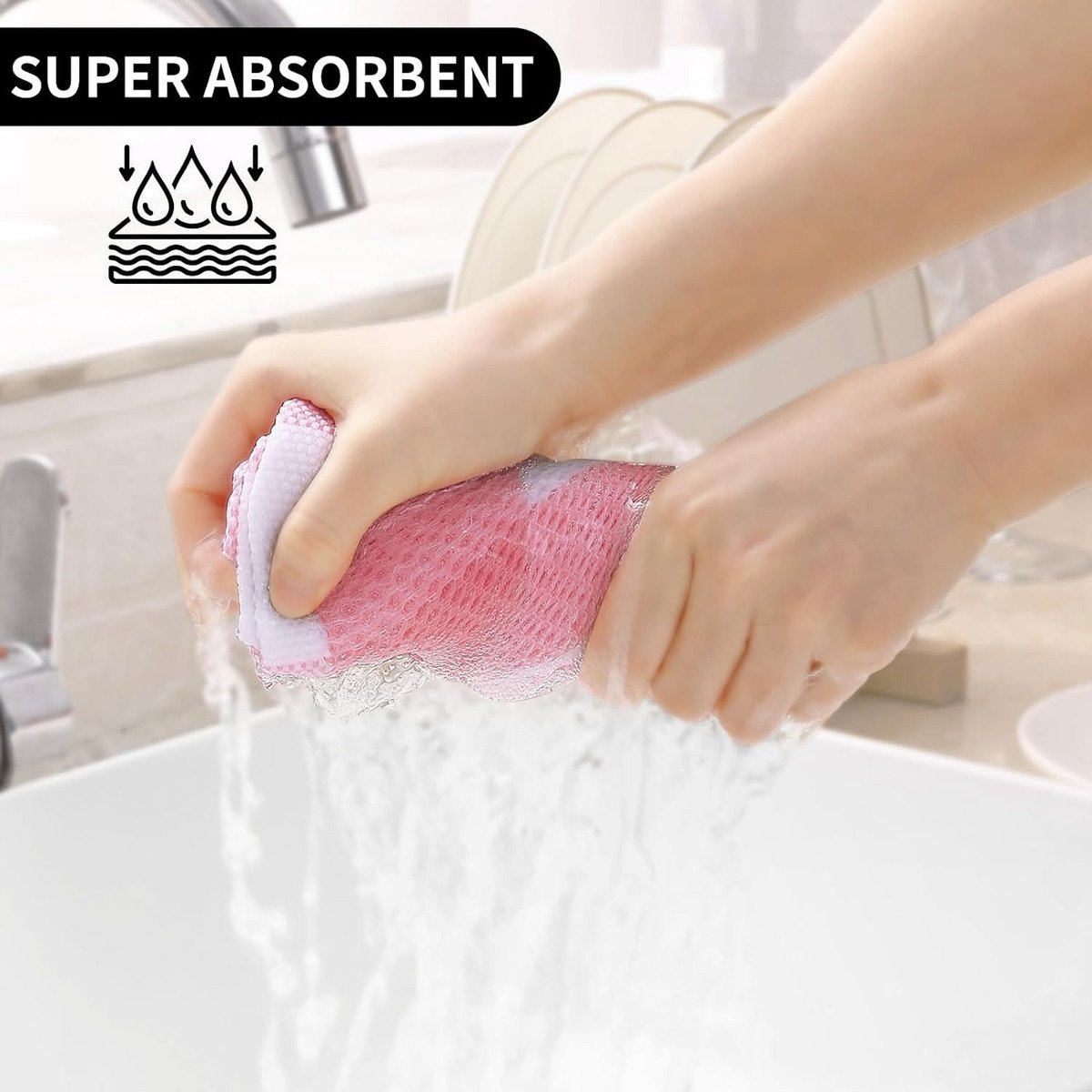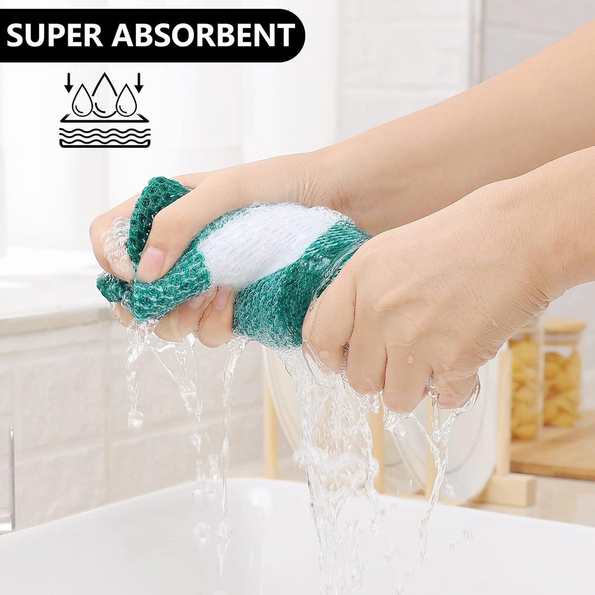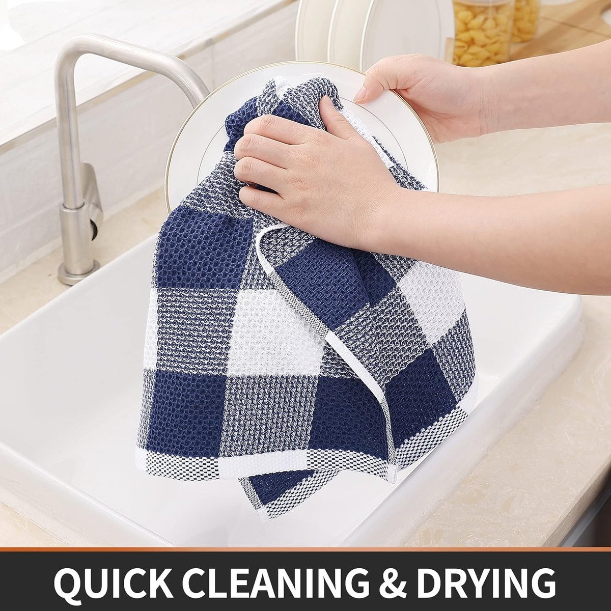 100% ALGODÓN: Paños de cocina de tejido de gofre 100% algodón que se sienten suaves y cómodos. El diseño único de panales hace que sea más duradero y se suaviza con cada lavado, por lo que estos paños de cocina no rayarán tus delicados utensilios de cocina, platos y sartenes.
