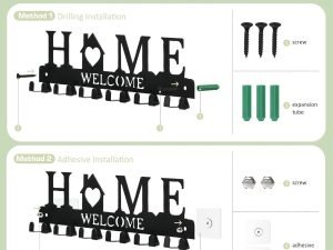 2 métodos de instalación: hay 2 tornillos y 2 clavos de expansión para la instalación de perforación, 2 adhesivos para instalación sin perforación, fácil de instalar y simplemente puedes elegir la forma de instalación adecuada que desees, proporciona un colgador de llaves estable para las cosas que más necesitas cuando estás fuera de casa, realmente buena idea para colgar las llaves y otros artículos.