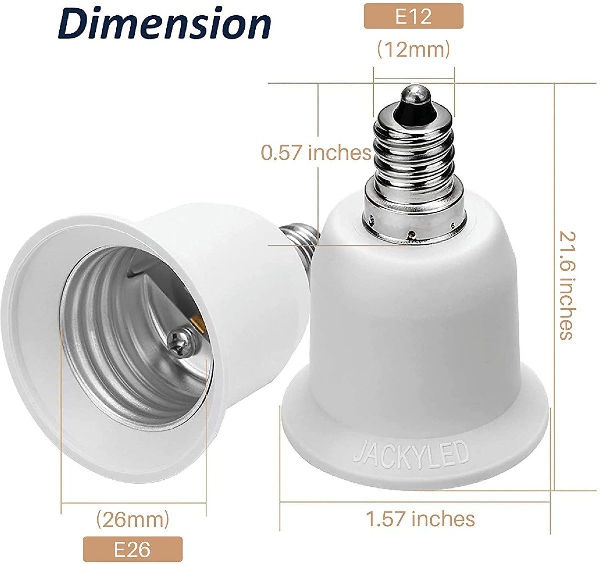 E12 a E26: este adaptador JACKYLED E12 se puede dedicar a transformar su lámpara de base E12 para que se adapte a cualquier bombilla de base media E26 / E27 estándar que cumpla con los estándares de eficiencia energética. Ideal para ventiladores de techo o luces con enchufes de candelabro que deben convertirse a una base mediana estándar.