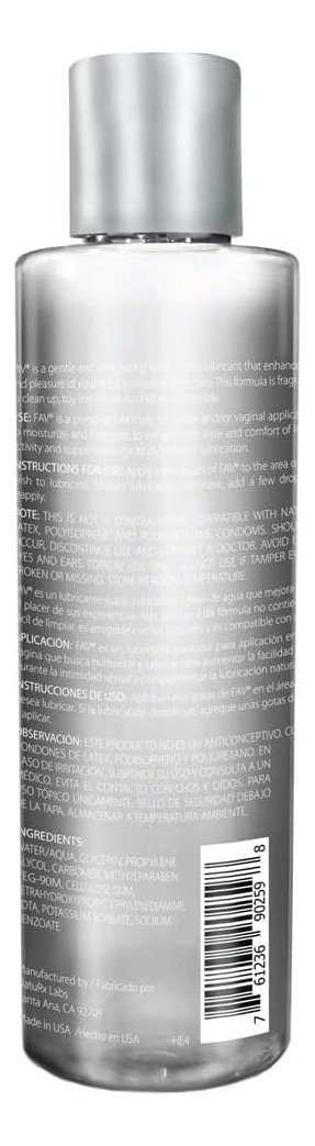 FÓRMULA PREMIUM A BASE DE AGUA: esta fórmula suave y duradera mejora la comodidad y el placer de sus experiencias más íntimas. FAV brinda comodidad y placer y es adecuado para pieles sensibles.