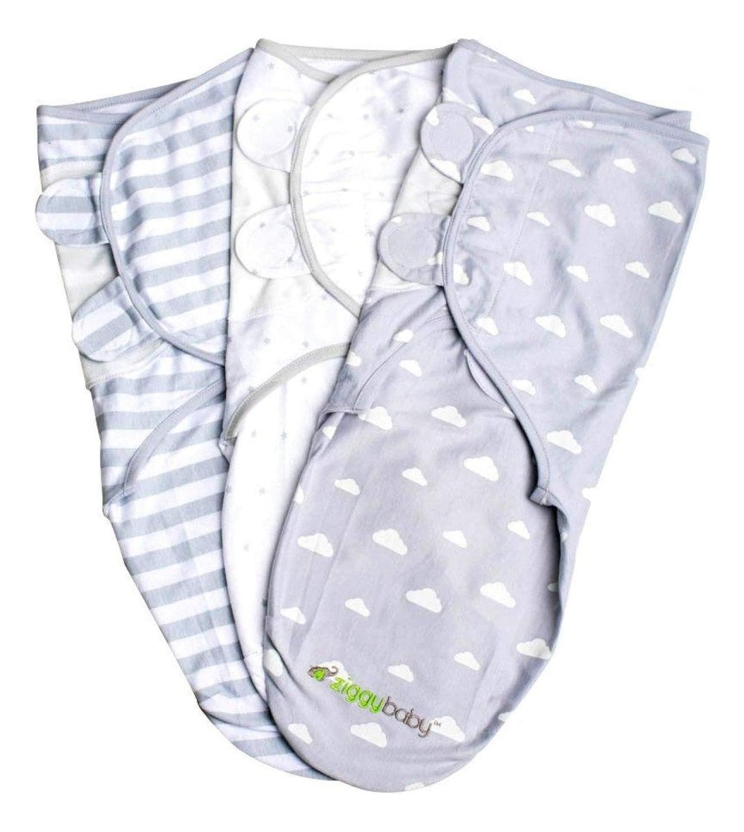 Manta envolvente, juego de envoltorios para bebés ajustables para bebés ziggy, paquete de 3 nubes de algodón suave gris, rayas y estrellas
