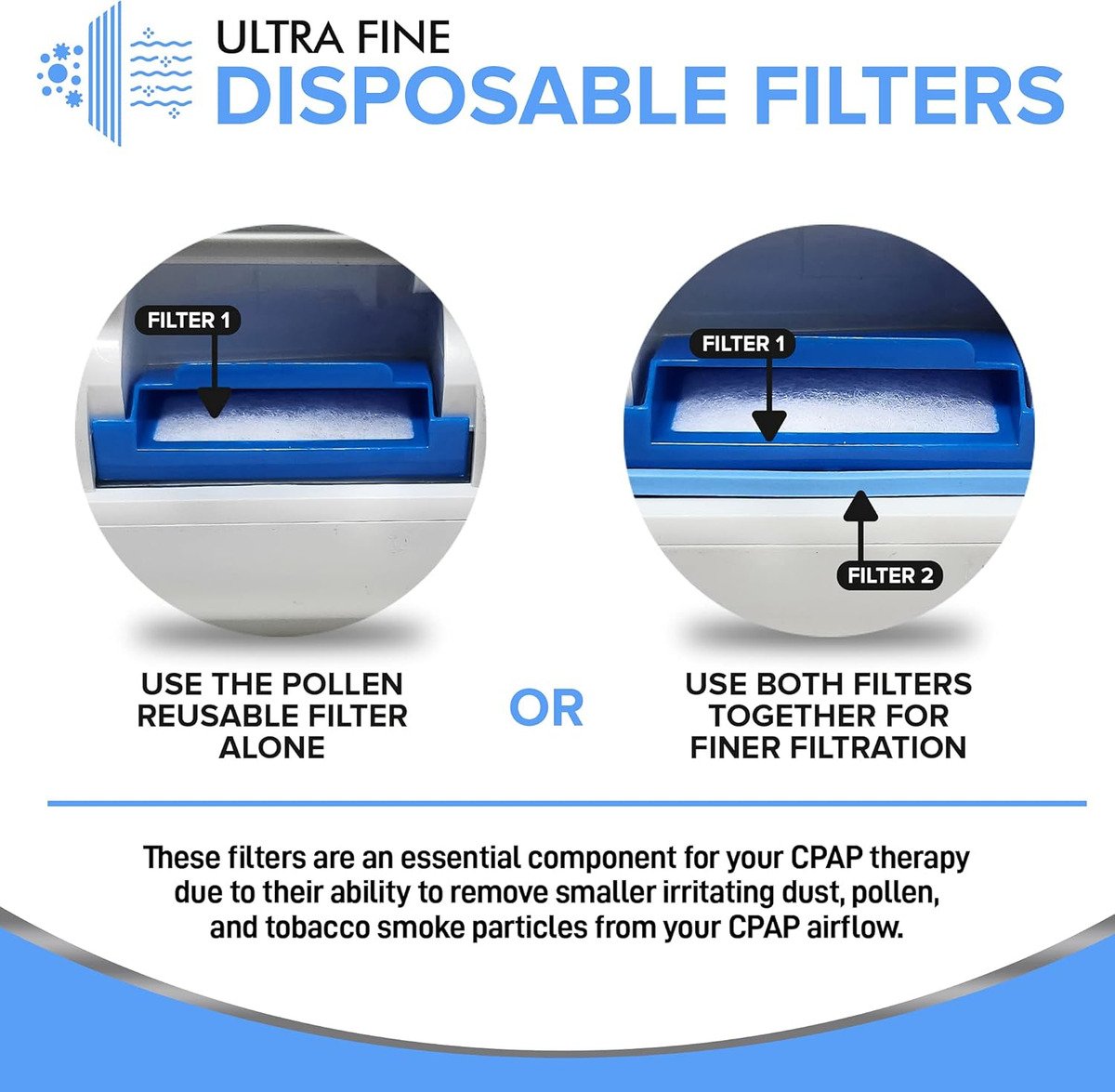 6 FILTROS DESECHABLES ULTRAFINOS: estos filtros son un componente esencial para su terapia CPAP debido a su capacidad para eliminar partículas más pequeñas e irritantes de polvo, polen y humo de tabaco del flujo de aire de su CPAP.