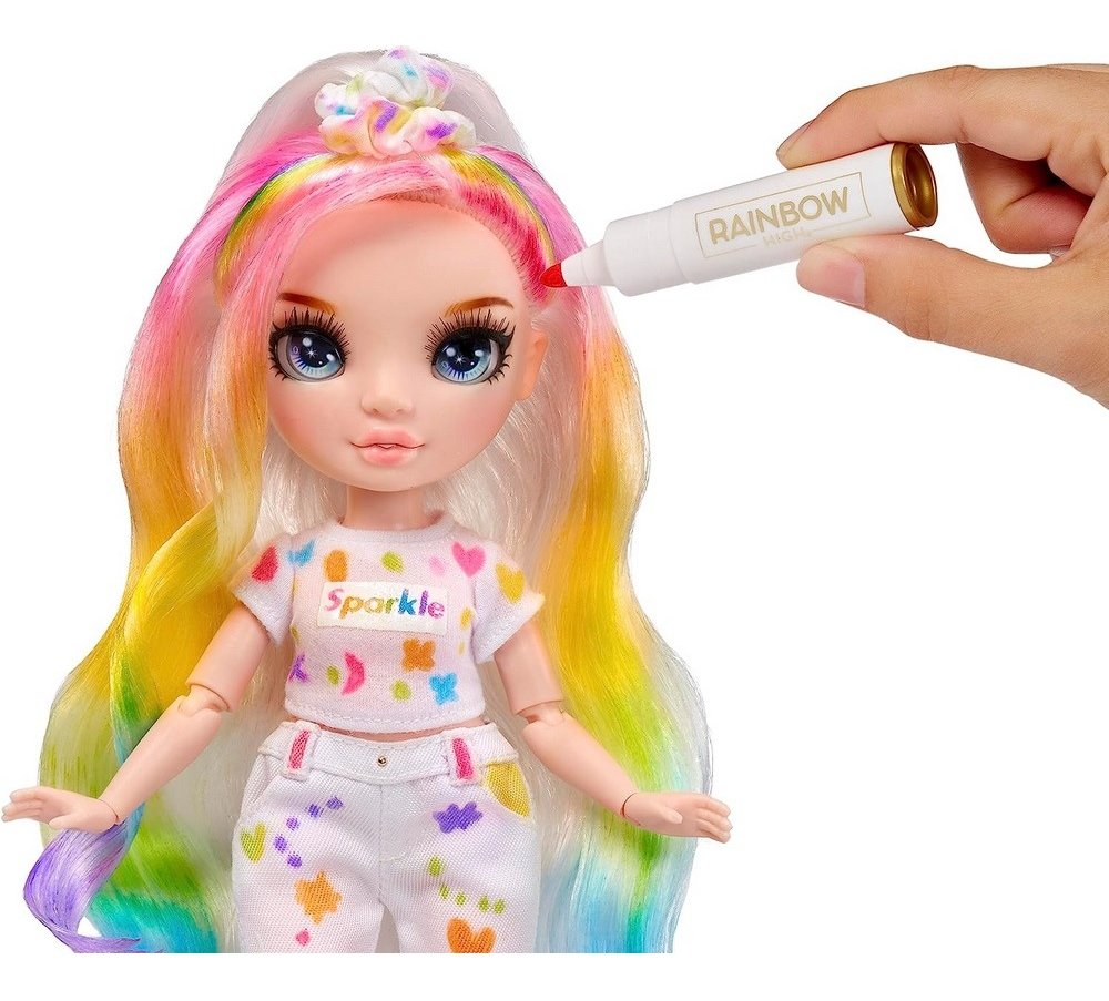 Inspira la creatividad: con Color & Create, es muy fácil crear tu propia muñeca Rainbow High personalizada. Con los marcadores lavables arcoíris incluidos, puedes colorear el cabello, colorear los atuendos, colorear los zapatos y colorear la coleta.