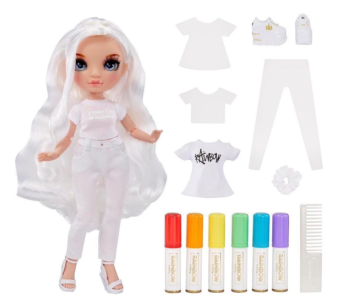 ¡Colorea! Tu muñeca Color & Create es un lienzo en blanco. Viene vestida de blanco, tiene el pelo blanco, y viene con top blanco adicional, par de zapatillas blancas y coleta, por lo que puedes colorearlo todo con el color del marcador lavable arcoíris incluido. Con marcadores rojos, naranjas, amarillos, verdes, azules y morados, puedes crear tu propia muñeca Rainbow High.