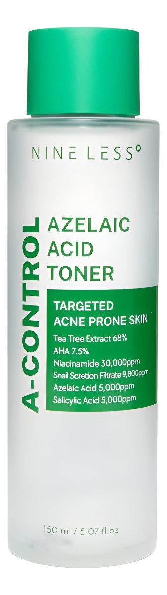Nine Less A-Control Azelaic Acid Toner es un tónico facial diseñado para personas mayores de 20 años que buscan una solución efectiva para el cuidado de su piel. Este producto combina las propiedades del ácido azelaico, conocido por su capacidad para iluminar y unificar el tono de la piel, con una fórmula hipoalergénica que calma y suaviza las irritaciones.