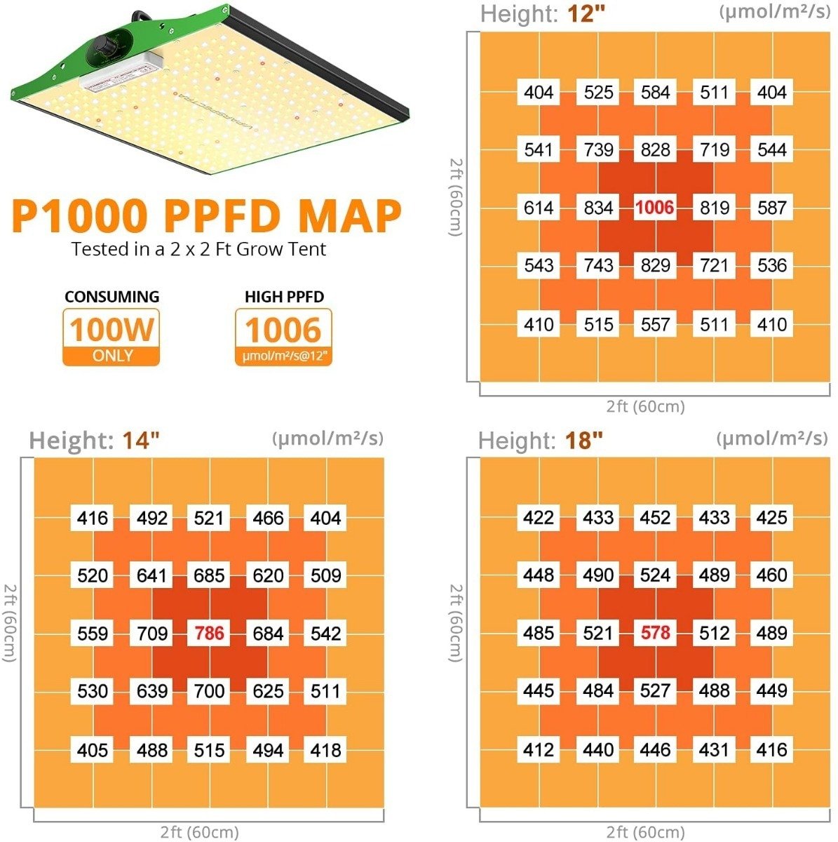 ILUMINACIÓN DE CRECIMIENTO DE BAJO CONSUMO DE ENERGÍA: ¡Comparable a los tradicionales 250W HPS / MH mientras consume solo 100W! Perfecto para una cobertura en etapa vegetativa de 76×76 cm de area a 46 cm de altura y una cobertura en etapa de floración de 61×61 cm de area a 36 cm de altura. Recuerde ajustar correctamente la altura y el brillo de acuerdo con el nivel deseado de sus plantas para un crecimiento óptimo.