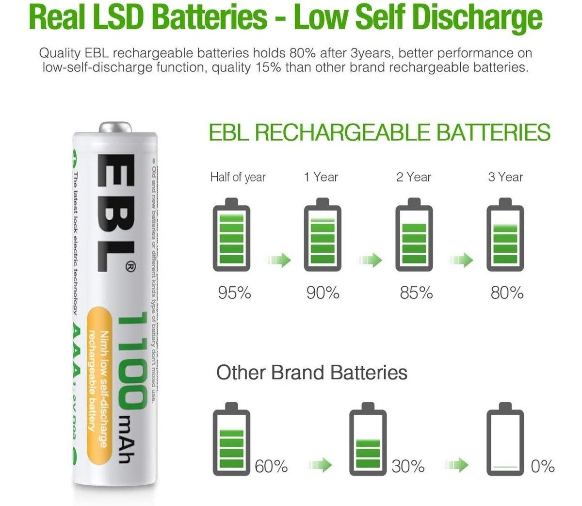Alta capacidad: ya no se debe preocupar por la resistencia de las baterías, las baterías EBL 1100mAh 1.2V AAA proporcionarán una potencia ultra fuerte para que sus dispositivos funcionen bien y funcionen por más tiempo.