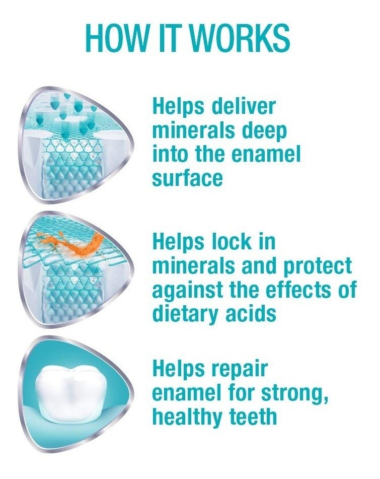 | Beneficios | Proporciona alivio a la sensibilidad y protección de sensibilidad duradera., Proteger contra los efectos de la erosión ácida, Refresca el aliento., Reparación activa del esmalte debilitado por ácido |