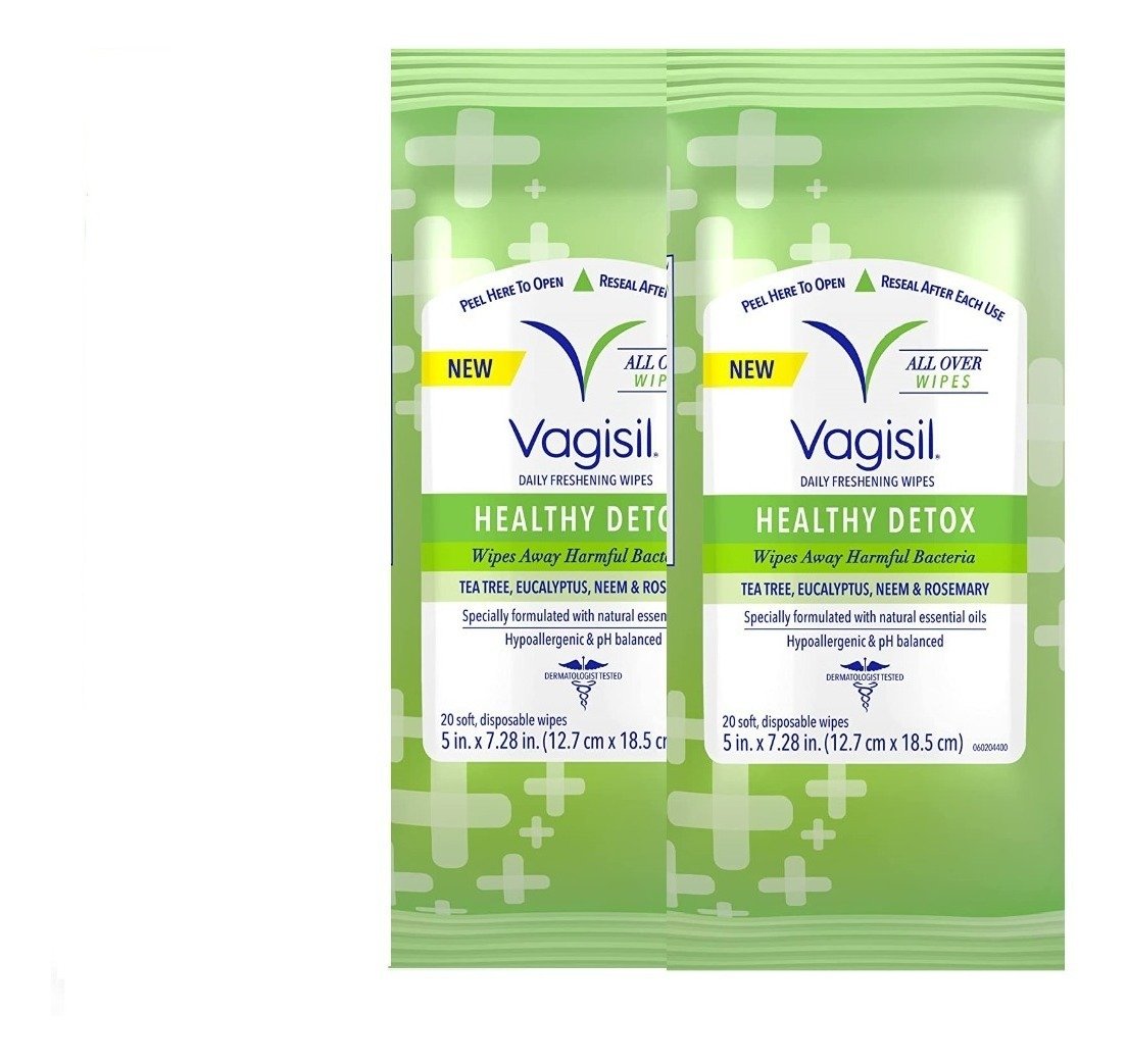 Incluye: 2 paquetes de 20 toallitas cada uno, para la higiene intima femenina Healthy Detox en una bolsa con cierre hermético.